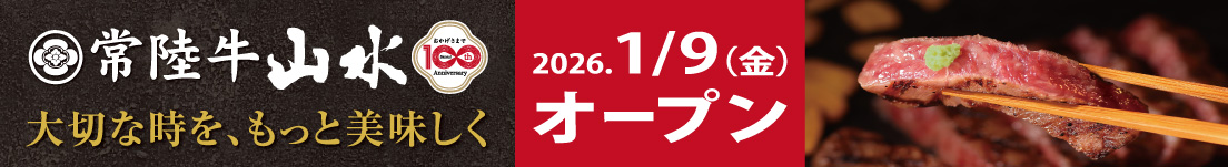 | お  知  ら  せ 『つくば山水亭 別亭』は2026年1月9日(金)より、 新しく『常陸牛 山水』としてオープンいたします。 なお、2026年1月6日(火)~8日(木)は、 オープン準備のため、休業いたします。 |