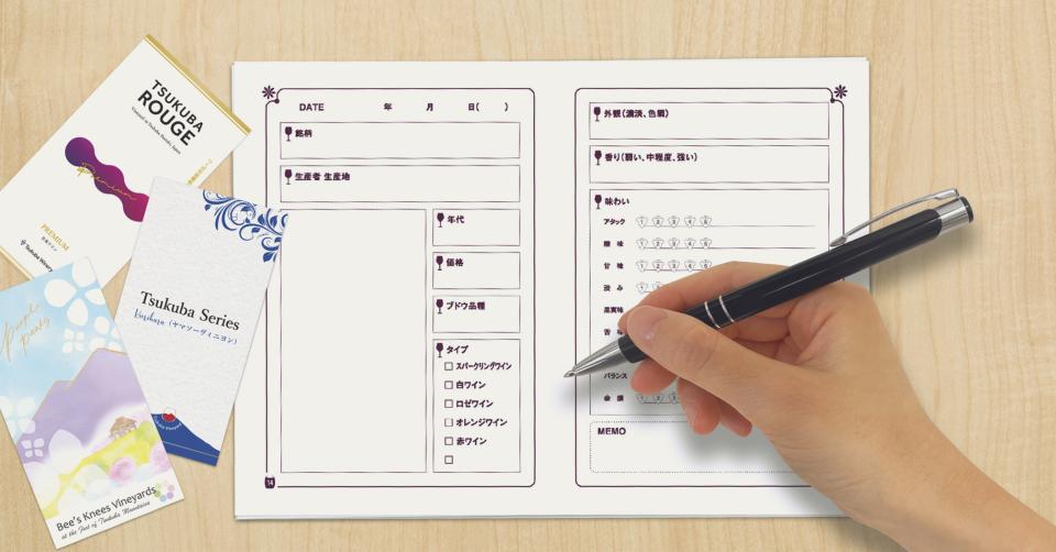 つくば市内3カ所のワイナリーのご紹介やワインの楽しみ方やテイスティングの手順、テイスティングメモページなど生産者のアドバイスとともにホテル日航つくばのシニアソムリエが監修した手帖です。テイスティングメモには、ワイナリーでワインを購入するともらえるエチケットのレプリカを貼り付けることができ、見た目や香り、味わいなどを記録できます。自分だけのオリジナルワイン手帖として活用いただけます。