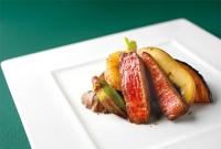 「飯村牛」の極上の味わいを損なわないよう火入れにも気を遣い、付け合わせの旬野菜にもこだわった一品。黒胡椒をアクセントに、シンプルな味付けで旨味を際立てております。