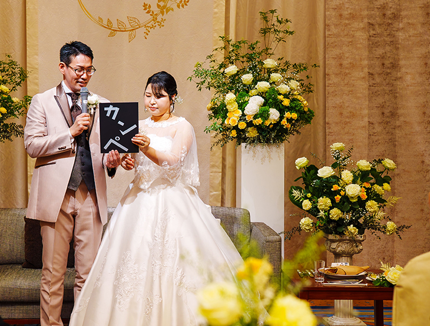 ナチュラルウエディングにしたいと思っていたので、高砂をソファに変更して、テーブルもサイドテーブルにしました。座っていてもドレスが見えるようにしたのは良かったなと思っています。テーブルコーディネートもナチュラルウエディングのイメージに合わせて、緑をメインにフラワーブーケと雰囲気を合わせてもらいました。カジュアルな雰囲気で会話を楽しめることを目指していたので、ぴったりの会場だったと思います。ウェルカムスペースも、会場装花と同じ松庄花壇さんにお願いしたので、統一感が出てとても良かったです。