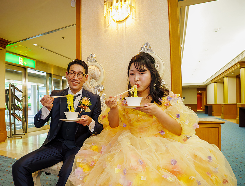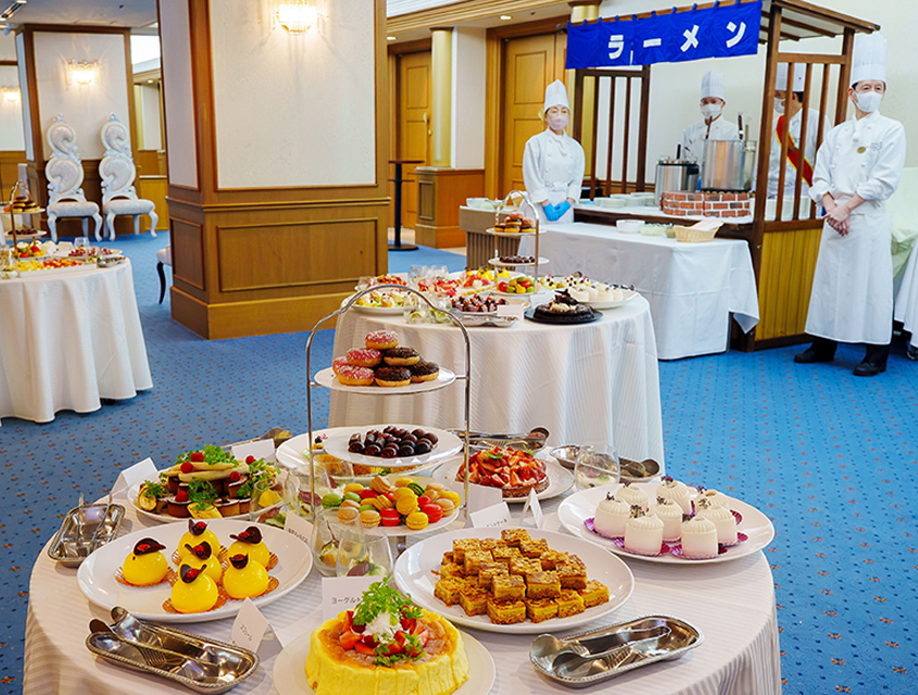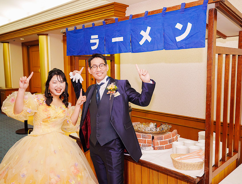 とにかく美味しいものをお腹いっぱい食べてほしいというこだわりから、ラーメンブッフェとスイーツブッフェを両方やりました。ゲストの方からも驚きの感想を多数いただいて嬉しかったです。ラーメンブッフェはホテル日航つくばさんとして前例がなかったとのことですが、出店のような外観と、茹でたての麺を提供していただけたのはとても驚きました。快く対応してくださった料理長に心から感謝です。鶏白湯のスープも締めラーメンらしくあっさりでとても美味しかったと好評でした。スイーツブッフェも卓ごとに内容が異なって、種類が豊富だったのも嬉しかったポイントです。ブッフェについて細かいことはお任せしていたのですが、お任せして良かったと思いました。